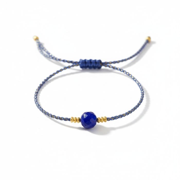 Martisor bratara reglabila, realizat din fir textil, piatra de lapis lazuli si elemente din cupru placat auriu