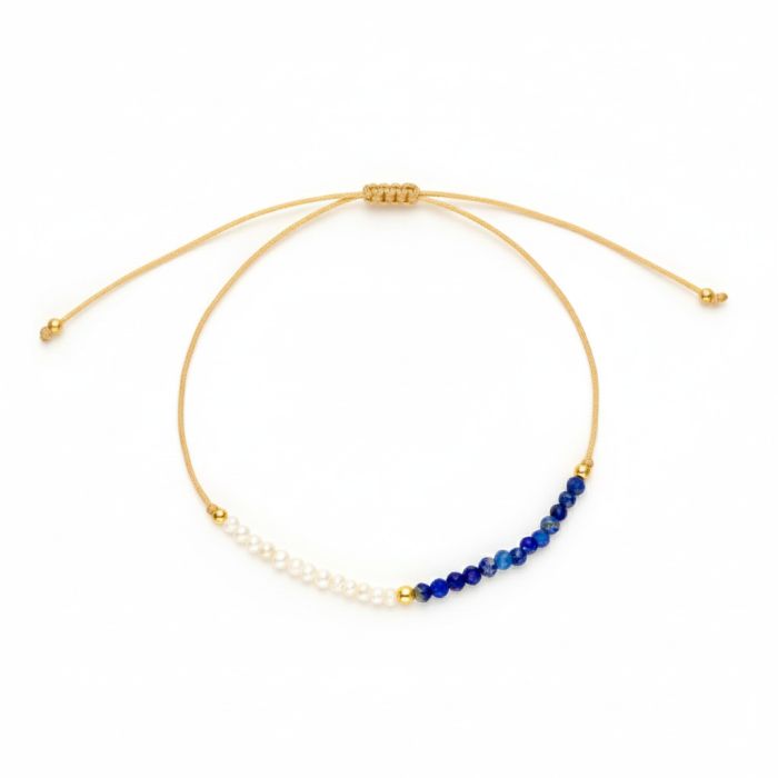 Martisor bratara reglabila, realizat din fir textil, pietre de lapil lazuli, perle si elemente din cupru placat auriu