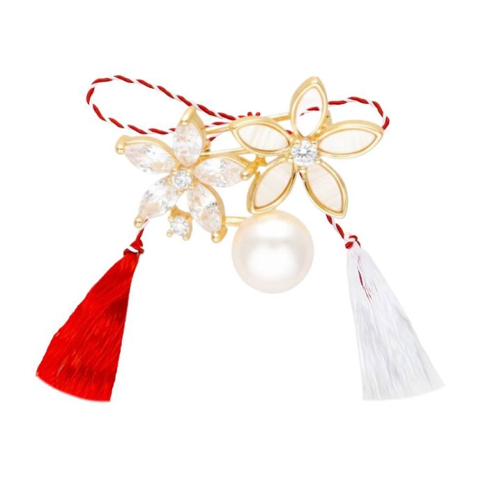 Martisor brosa, realizat din perla de cultura 8 mm si element decorativ din cupru placat auriu si ornat cu cubic zirconia